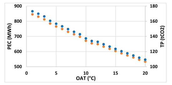 Primary energy consumption (PEC) in blue and tons of CO2 produced (TP) in orange as a function of OAT (°C) for a thermal load set at 359 kW and LWT of 50 °C.