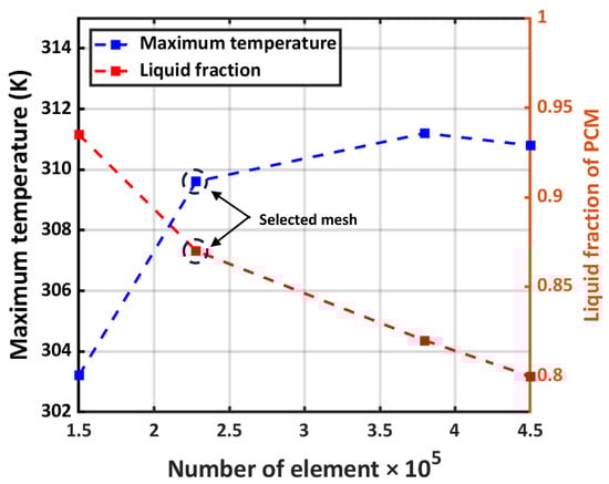 The ANSYS workbench is employed to generate a hexahedral structured mesh using appropriate processing tools for computational fluid dynamics (CFD) analysis. The governing equation is solved using a pressure-based solver in ANSYS Fluent software. To couple pressure and velocity, the SIMPLE algorithm is employed. The internal heat generation of the batteries is determined using a user-defined function (UDF) based on mathematical models. To ensure grid independence, three different grid sizes (150,000, 228,000, 380,000, and 454,000) were utilized for the computational domain. It was observed that the maximum temperature and PCM liquid fraction at 100 s, variation between the last two grids during discharge process with 5C discharge rate, 25 °C ambient temperature, and mass flow rate of 0.44 kg/hr was less than 5% and 5.7%, respectively. Figure 2 illustrates the variation of the maximum temperature for the various grids.