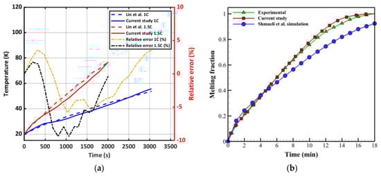 In Figure 3b, the fraction of PCM melting is depicted over 18 min, and a comparison is made between the numerical results of this study and the experimental and numerical findings reported by Shmueli et al. [52]. Initially, the PCM starts melting at 22 °C when the adjacent walls’ temperature is above the fluid’s melting point at 30 °C. The numerical results obtained from this study have demonstrated acceptable accuracy with a deviation of less than 5% compared to the experimental data, as shown in Figure 3b.