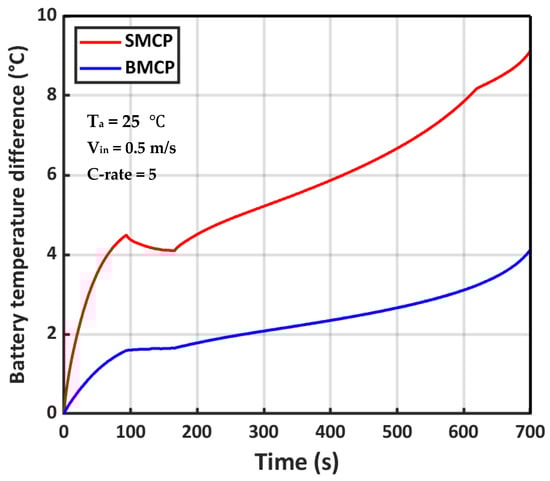 Battery cell temperature difference for SMCP and BMCP in 5C discharge rate.