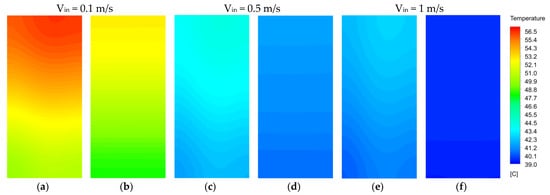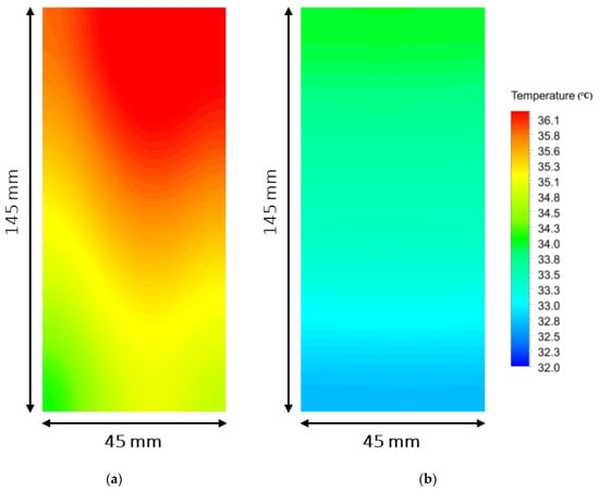 Figure 6 depicts the temperature contour of the battery cell for SMCP and BMCP at a 5C discharge rate, 0.5 m/s inlet velocity of coolant, and 25 °C ambient temperature. It can be observed that the temperature contour and temperature distribution are the same with the zone around the inlet port being cold and the outlet being hot. During discharge, as coolant liquid flows inside microchannels, the generated heat inside battery cells is conducted to the coolant liquid and the water bulk temperature increases. As expected, the maximum temperature of water was achieved at the outlet port surface. In similar working conditions, SMCP utilizes four straight microchannels to dissipate generated heat along the length of the battery cell, and, as shown in Figure 6a, owing to the liquid coolant, the temperature increased and as a result, the convection heat transfer coefficient decreased and maximum temperature occurred in the vicinity of the outlets port. To overcome this issue, four straight microchannels branched to increase liquid channels and battery cell surface thermal contact. As illustrated in Figure 6b, the maximum temperature in the battery decreased significantly; meanwhile, a better temperature distribution was achieved compared to SMCP.