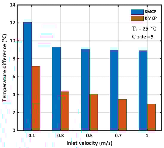Battery maximum temperature difference with respect to velocity at a 5C discharge rate for SMCP and BMCP cooling systems.