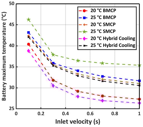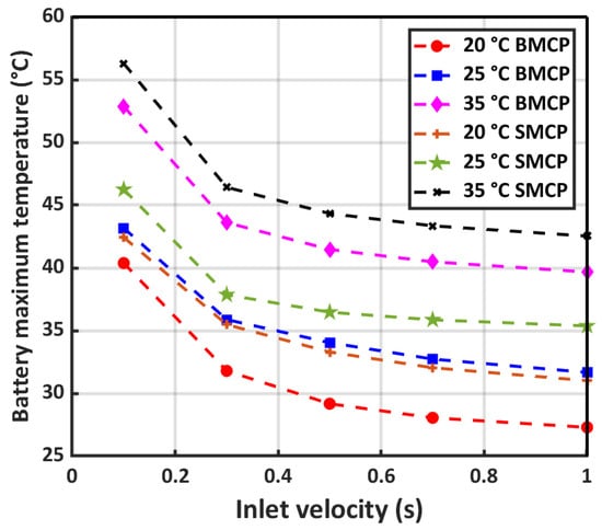 EVs must be capable of operating in various environmental conditions. In this section, the thermal performance of the designed cooling systems at different ambient temperatures of 20 °C, 25 °C, and 35 °C under a 5C discharge rate and specific range of inlet velocities of 0.1 m/s to 1 m/s is investigated. Figure 8 illustrates the battery maximum temperature variation with respect to inlet velocity in the three mentioned ambient conditions for both proposed cooling systems. Water as the coolant liquid enters the microchannel without precooling and the thermal equilibrium is ambient. Obviously, the maximum temperature decreases as inlet velocity increases in all ambient conditions due to the higher convection heat transfer coefficient. At 0.1 m/s inlet velocity, the maximum temperature difference between BMCP and SMCP is slightly higher than 3 °C, while the inlet velocity reaches a 1 m/s temperature, the difference between the two cooling systems reduced to 2 °C because the heat generation rate in the battery cell remains constant while the heat transfer capacity in both systems increased.