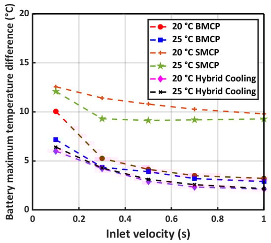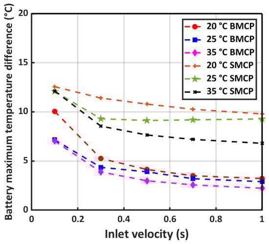 In view of the temperature difference parameters, two critical zones are the inlet port and outlet port, which are the cold and hot areas of battery cells, respectively. Figure 9 shows the temperature difference variation inside the battery cell with respect to inlet velocity at different ambient temperatures of 20 °C, 25 °C, and 35 °C. LIB thermal conductivity in the thickness direction is significantly lower than along the surface. As a result, in a high water temperature, the lower temperature gradient in the thickness direction caused better temperature distribution and the maximum temperature difference decreased. As shown in Figure 9, the maximum temperature difference for both SMCP and BMCP increased when the ambient temperature was reduced from 35 °C to 20 °C. In addition, the inlet velocity effect on temperature differences was investigated. The maximum temperature difference in 0.1 m/s in 20 °C ambient conditions for SMCP and BMSP is 12.56 °C and 10 °C, respectively. By increasing the inlet velocity to 1 m/s, this parameter reduced to 9.79 °C and 3.22 °C, respectively. As is clear, BMSP reduces the temperature difference significantly compared to SMCP in the same working conditions. Meanwhile, increasing velocity led to a reduced temperature difference of 22% and 67.8% in SMCP and BMSP, respectively.