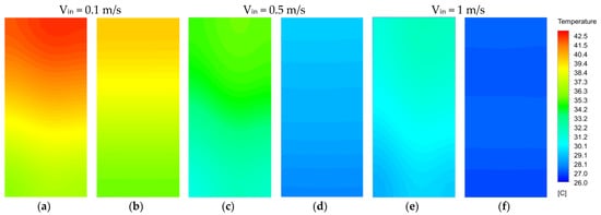 At the beginning of the simulation, the ambient temperature was assigned to all domain temperatures. Three different ambient conditions (20 °C, 25 °C, and 35 °C) were considered for this study. A symmetric boundary condition was applied to both sides of the computational domain, as well as to all walls except for the inlet and outlet, which were treated as adiabatic walls. The velocity at the inlet was set to specific magnitudes (0.1, 0.3, 0.5, 0.7, and 1 m/s), the pressure at the microchannel outlet was set equal to the ambient pressure, and the fluid inlet temperature was set to the ambient temperature for each simulation.