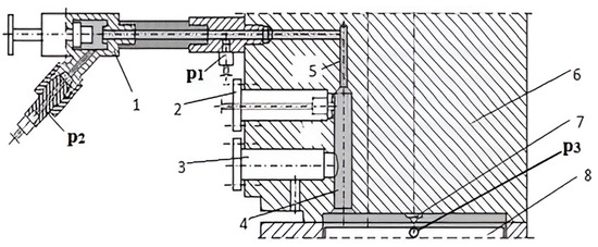 The arrangement of cylinder pressure sensors in the engine head for experimental tests. p1: sensor mounted in a special adapter between the indicator valve and the connecting channel; p2: pressure sensor mounted after the indicator valve; p3: pressure sensor mounted in the prepared mounting hole of the cylinder liner flange; 1: indicator valve; 2: start valve; 3: head safety valve; 4: cylinder connecting channel; 5: measurement channel; 6: cylinder head; 7: injection valve; 8: combustion chamber.
