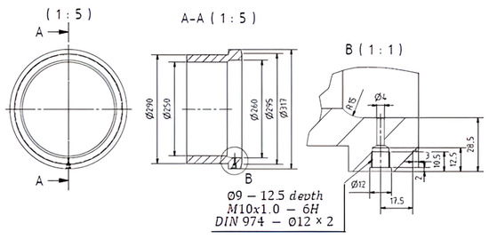 A new and innovative measuring place was established in the mounting hole in the cylinder liner flange, marked as p3 in Figure 1 and Figure 2. The mounting hole was prepared in accordance with the recommendations of the pressure sensor manufacturer, Kistler (the dimensions of the mounting hole are shown in Figure 3).
