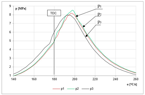 - The CA angle at the maximum combustion pressure (αpmax) was by far the lowest for p3. Large differences in the value of this parameter were noticed for other measurement points.