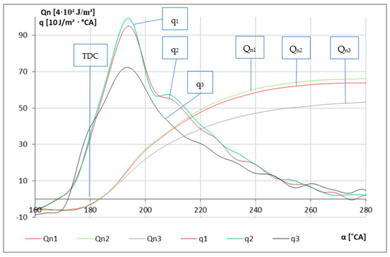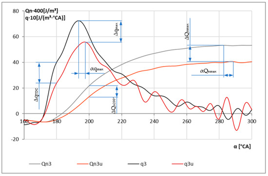 For diagnoses ascertained using heat-release characteristics, simply assumptions are generated. The heat released is defined as the net heat released. The net heat released is the sum of the internal energy and the work of the system. The simply assumptions result from the difficulty of calculating the cooling heat and load losses due to the gas blow-by. The simplification regarding the cooling heat is related to the assumption that the cooling heat takes the same value for all cylinders and has a minor impact on the heat-release functions. This collinearly depends on the temperature of the working medium and the surface of the cooled walls of the combustion chamber [28,38]. The assumptions simplifying the load losses should take into account, among other items, the chemical composition of the fuel, the fuel injection mass rate, and the amount of air charge. From the Equation (1) of the first law of thermodynamics, we can determine the formula for the net heat release as follows: