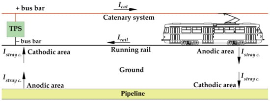 Today, rapid transits and tramways in urban areas are operated at DC with voltages that are mostly in the lower range, namely, 600V–750V [3]. There are also several systems that operate at voltages of 1500 V and 3000 V, as suburban commuter and city railways. Power is supplied by traction power stations (TPS) to the vehicles or trains via catenary/third rail and pantographs/current collectors, and in most cases rails are used as the return current path [4,5]. When traction current flows back to the TPS, the longitudinal electrical resistance of the rails causes a voltage drop and thus a difference of potential between the rails and the ground. This rail potential is variable along the track and is generally lowest at the TPS [6]. Since rails have a finite value of longitudinal resistance and usually poor insulation from earth, the traction current flowing through the rail may significantly leak into the earth and bury conductive parts before reaching the TPS. This current is referred to as stray current [7,8].