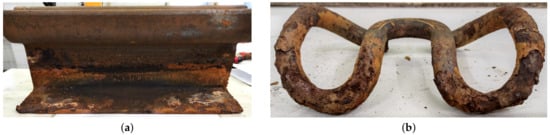 The effects of stray current on rail and fastening system components are discussed in [28,29], where several rail samples fastened to a concrete base using different types of fastening systems were immersed in water (simulating inadequate track drainage) and subjected to DC current flow. It was concluded that stray current causes localized damage to the rail foot and fastening system components, particularly the clips. A posthumous 3D scan of rails and clips helped determining the loss of material and the consequential cross-section reduction: after 1344 h, the reduction was quantified up to mm (37.12%) and mm (37.07%) for the rail and clip, as shown in Figure 2.