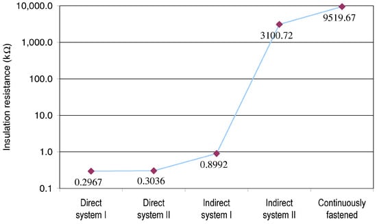 During the service life of the track, the most important factor is keeping the track dry and well-drained to prevent contact between the rails and the electrolyte, i.e., the water that remains in the track. During track construction, anchor bolts cannot cut the reinforcement bar or be in contact with the reinforcement bar in the concrete base slab [47]. When effective drainage is provided in tracks with discretely fastened rails and the rails are not in contact with the electrolyte, each fastening system provides a spot resistance to ground [48], so by using the appropriate type of the fastening system, values can be increased. The electrical resistance of five different types of fastening systems on concrete base is analyzed in paper [49]. The results show that the electrical resistance of indirect fastening systems is significantly higher than resistance of direct systems, with an incomparably higher electrical resistance value found in the sample of continuously fastened rail (Figure 5).