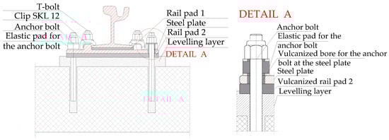 These direct and indirect fastening systems are characteristic of tracks with discretely fastened rails, in which the rail is supported by an elastomer pad (rail pad) on a steel base plate laid on a concrete base. In direct systems, the rail is fastened with clips and anchor bolts. The anchor bolts provide anchorage of the fastening system in the concrete base (Figure 6). In the indirect systems, the rail is fastened to the steel plate by means of clips and T-bolts, and the anchor bolts are separate and serve only to anchor the steel plates in the concrete base (Figure 6). In the direct fastening system, all elements are in direct contact and the clip is in contact with the rail, which is why the current flows from the rail into the concrete base. In indirect fastening systems, higher electrical resistance is achieved by insulating the anchor bolts from the steel base plate.
