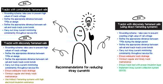 Stray currents can cause very rapid degradation and material loss at the points where the current leaves the metal and enters the electrolyte. Nowadays, many resources are invested in the protection of jeopardized structures, such as buried pipelines, from stray current corrosion. This paper describes the measures that need to be considered in the design and construction of track structures to ensure high rail-to-ground resistance and consequently reduce stray currents. The main conclusions from existing guidelines and standards for reducing and controlling stray currents that are applied by various track operators are presented in the paper. Rail-to-ground resistance in different types of tracks structures and rail fastening systems is analyzed, and the optimal type of the track and type of the fastening system is defined. The grounding schemes used on the tracks and their influence on stray current values are described, as well as the influence of traction power stations (TPS) and rail cross bonding on stray current. Since it is not necessary to apply all the measures described to the same track structure, the paper gives recommendations on which measures to apply when building tracks with continuously fastened rails and which to apply when building tracks with discretely supported and fastened rails.