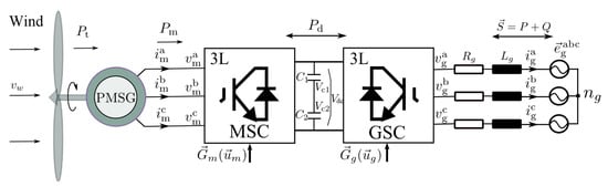 The discrete and continuous time models of the three-level back-to-back PMSG wind power generation system are introduced in this section (see Figure 1). The machine side is represented by the subscript m, and the power grid side is represented by the subscript g. The variables represent the converter’s current and voltage, grid voltage, resistance and inductance. The capacitor voltages , and are the voltages of the equalizing capacitor , on the DC bus and the speed of the PMSG, respectively. The powers P, Q are the output active and reactive power, respectively. The back-to-back 3L-NPC includes two three-level converters and a DC link. There are two equalizing capacitors in the DC link. The AC voltage of the converter is expressed as: