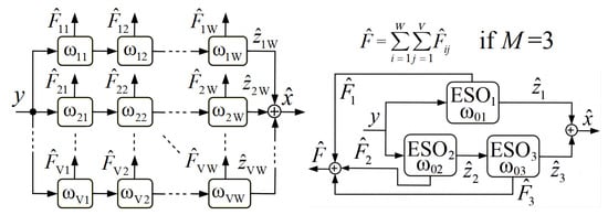 We propose a PCESO that uses not only multiple sub-ESOs to estimate and sum the system disturbance , but also uses multiple sub-ESOs to estimate and sum the . This method can effectively balance the robustness of parameter mismatch and noise suppression. The proposed PCESO is structurally depicted in Figure 4. There are several rows and columns of sub-ESOs (V and W, respectively, in the Figure 4) [19]. There are a total of M sub-ESOs. The sub-frequency of each sub-ESO is . The time-domain model of the PCESO (three sub-frequencies) is as follows: