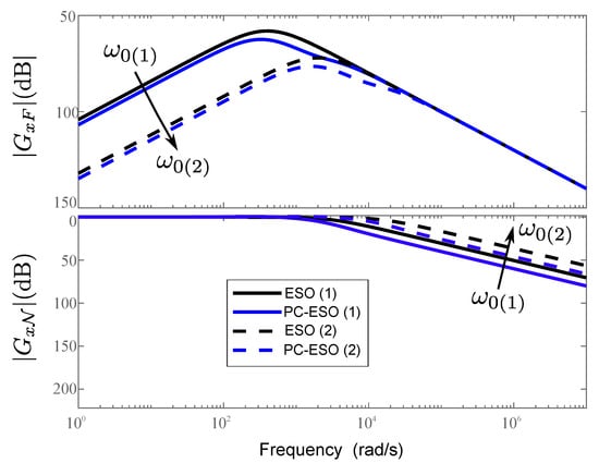 Figure 5 shows the Bode plots of the proposed PCESO compared with a classical linear ESO at and kHz. The bode plot of shows the disturbance robustness. From the Bode magnitude plot of , the PCESO has the smallest estimation error in a noise-free environment and is more robust to parameters. And, it has high estimation accuracy over a wide frequency range. Also, the PCESO has the lower state estimation error for both low and high bandwidths. Nonetheless, both have better disturbance rejection (lower state estimation error) as the bandwidth increases. Bode plots of show the noise attenuation ability. It can be seen that, in a Gaussian white noise environment, both the ESO and PCESO have good noise suppression ability (with a high-frequency roll-off slope of −20 dB/decade). However, the PCESO has a lower error magnitude, for both low and high bandwidths. This indicates the superior noise suppression potential of the PCESO over the ESO.
