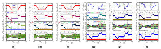 Dynamic performance without parameter mismatch and noise. Machine-side: (a) Classical MPC; (b) MPC-ESO; (c) Proposed MFPCC-PCESO. Grid-side: (d) Classical MPC; (e) MPC-ESO; (f) Proposed MFPCC-PCESO.