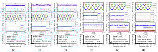 This scenario tests the three methods’ performances without parameter mismatch and measurement noise. The active power decreased from 2 MW to 1 MW at 0.1 s and back to 2 MW at 0.25 s. The dynamic performance is shown in Figure 7. For the machine side, the plots are: speed, electromagnetic torque, and three-phase stator currents. On the grid side, there is the DC-link voltage, and three-phase grid current, and output power. The steady-state performance is shown in Figure 8. The plots are electromagnetic torque, three-phase and stator current on the machine side. There is three-phase and grid current, output power and the current spectrum, on the grid side.
