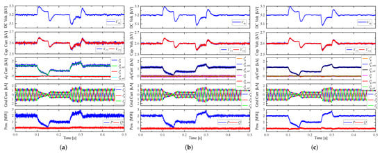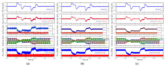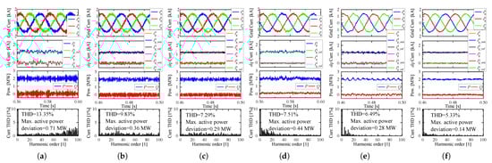 This scenario compares the robust control performance of the proposed MFPCC-PCESO relative to the other two state of the art methods under conditions of measurement noise along with parameter mismatches of grid-side and . The active power decreased from 2 MW to 1 MW at 0.1 s and back to 2 MW at 0.25 s. Dynamic performances are shown in Figure 9 and Figure 10; there are DC voltage, capacitor voltage, axis and three-phase grid current, and output power. Figure 11 shows the steady-state performance of the three methods under parameter mismatches of and with sensor measurement noise. There are three-phase and axis grid current, output power, and the current spectrum.