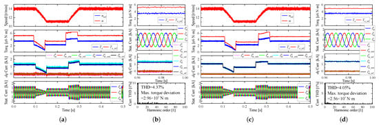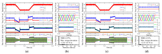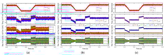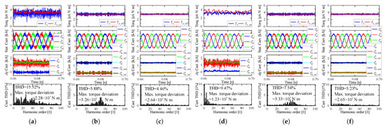 Steady-state control performance for mismatches are shown in Figure 14: classical MPC has a larger current ripple and THD due to its inability to suppress noise. Both the MPC-ESO and proposed MFPCC-PCESO are based on the ultralocal model and have better immunity to parameter variations than MPC. However, the MPC-ESO’s is weaker in noise suppression than the proposed method. Specifically, the MPC-ESO has poor high-frequency noise attenuation attributes in Figure 14c,e. However, the proposed method has superior ability for sensor noise attenuation in both low- and high-frequency ranges. Hence, at mismatch, the MFPCC-PCESO gives and lower THD than MPC and the MPC-ESO, respectively. At mismatch, the MFPCC-PCESO gives and lower THD than MPC and the MPC-ESO, respectively. Furthermore, the maximum torque deviation of the MFPCC-PCESO is and lower than MPC’s at and , respectively.