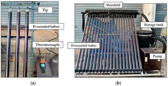 The experimental set shown in Figure 1a was set up to measure the temperatures of the heat pipe tips. The experiment was set up at the School of Engineering, King Mongkut’s Institute of Technology Ladkrabang, Bangkok (latitude 13°43′35″ N and longitude 100°46′20″ E), while the experimental set in Figure 1b was set up for the heat pipe evacuated-tube solar collector performance.