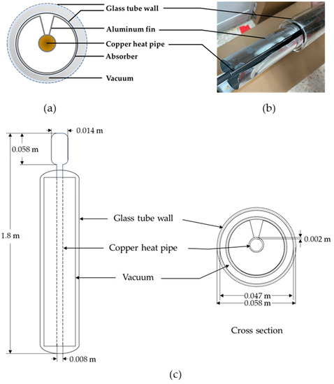 (a) Schematic diagram of an HP-ETSC cross section, (b) components inside an HP-ETSC and (c) sizes and geometry of an evacuated-tube solar collector.