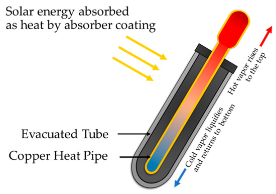 A space between concentric glass tubes was vacuumed to reduce thermal energy loss from conduction and convection. The copper heat pipe was wrapped with an aluminum sheet to promote the heat conduction. The phenomenon occurring inside the heat pipe when absorbing heat from the sunlight is illustrated via Figure 3.