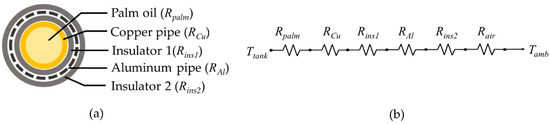 Heat loss from the manifold is estimated by considering the thermal resistance (the reciprocal of thermal conductivity) of each component arranged in series along the manifold cross-section, as shown in Figure 4. In each loop of calculation, we approximated the difference between the palm oil manifold inlet temperature and the ambient temperature as a driving force to calculate heat loss term.
