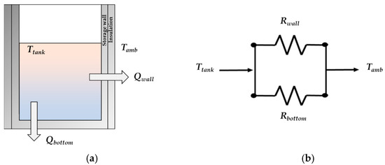 Considering the heat loss term , expressed in Figure 5a and represented in the form of an equivalent thermal resistance circuit in Figure 5b, the thermal resistances of the storage tank wall () and the bottom () can be calculated from Equations (11) and (12), respectively.