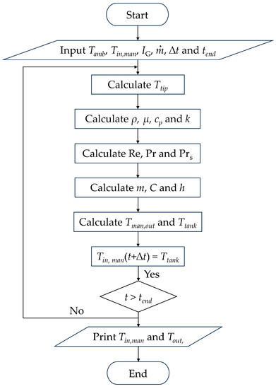 Before running the program, the ambient temperature, manifold inlet palm oil temperature measured at the initial time, measured solar intensity, mass flow rate of the palm oil, time step and end time were input into the program. In the program, the ETSC starting time was set as t = 0. The time step and end time were set as 1 s and 7 h (9:00–16:00), respectively. Then, when the program was run, the heat pipe tip was calculated. Next, the properties of palm oil at the manifold inlet and the palm oil temperature were calculated following Reynolds number, Prandtl numbers and heat transfer coefficient calculation. Finally, the manifold inlet palm oil temperature and the palm oil temperature in the storage tank were calculated. The palm oil temperature in the storage tank was set as the manifold inlet palm oil temperature for the next loop. The program was terminated when the operating time was longer than the end time. The palm oil manifold inlet and outlet temperatures were exported and compared with the experimental results.