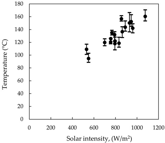 To observe the change of heat pipe tip temperature with the variation of solar intensity, the heat pipe tip temperature was measured, and solar intensity was recorded from 9:00 a.m. to 4:00 p.m. for several days during September 2020, using the experimental set in Figure 1a. The solar intensities and heat pipe tip temperatures were plotted to investigate the trend of tip temperature change with the solar intensity as shown in Figure 7. It must be noted that commercial-grade evacuated tubes may not be identical. Some few differences, such as the thickness and uniformity of absorptive coating, degree of vacuum, amount and fraction of working fluid and arrangement of aluminum fin, can lead to significant overall difference in the performance of each tube. The error bars shown in this plot include mainly the unidentical performance of the evacuated tubes, while the bullet data represent their average performance at different solar intensity.