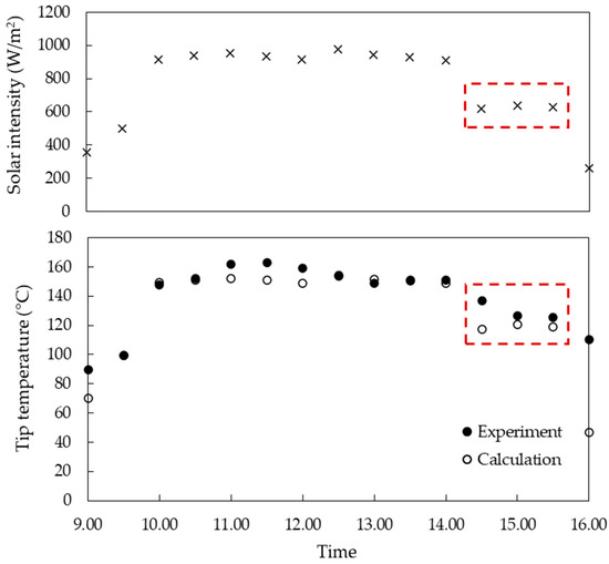 It is seen that the calculated tip temperatures follow the trend of the measured tip temperatures that change with the solar intensity during the day, particularly at high solar intensity. As observed in the red dashed box, the predicted heat pipe tip temperature deviates more when solar intensity immediately drops because, though the solar intensity drops at a particular time, the heat absorbed still remains in the working fluid inside the heat pipe in the form of latent heat of condensation and sensible heat (Elsheniti et al. [12] defined this term as “the heat from thermal mass”) where the vaporization–condensation cycle occurs. It is also observed that the effect of this remaining heat declines within a short time, since the amount of working fluid stored in the heat pipe is very little (about 5 mL [8]). The predicted values are closer to the measured ones again when the solar intensity stays at a similar level. Overall, the average deviation of calculated results and experimental results was 9.8 °C, or about 7.10% deviation from the average measured temperature. It should be noted that the massive error compensated for in the all-day total error was at 16:00, when the solar intensity drastically dropped. Excluding this datum, the average error could be reduced to 6.0 °C (about 4.34%). Furthermore, the error is expected to decrease when increasing the frequency of solar intensity measurement.