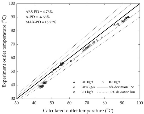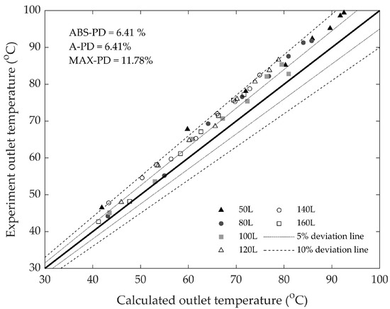 The palm oil outlet temperatures from the evacuated-tube solar collectors arranged in series were examined using heat transfer calculation and experiments, as described in the previous section. The initial temperatures of the inlet palm oil measured at the ambient level from the six experiments (six storage capacities) ranged from 32 °C to 34 °C [8], with a mass flow rate of 0.032 kg/s (Re ≈ 50). These were input in the MATLAB program. As previously mentioned, the experiment cannot be directly repeated with the same condition, as the solar intensity cannot be controlled; the calculated results compared with six sets of experimental data should make the validation of the mathematical model more reliable. The level of underestimation is shown through the plot in Figure 9. The diagonal line in the figure stands for 0% deviation from the experimental results. The average percentage deviations (A-PD) for different storage capacities lie in the range of 4.52–7.75%, while the overall absolute percentage deviation (ABS-PD) and maximum deviation (MAX-PD) are 6.41% and 11.78%, respectively.