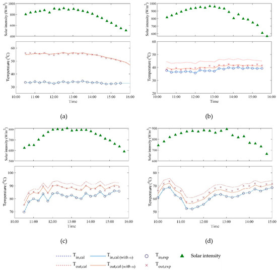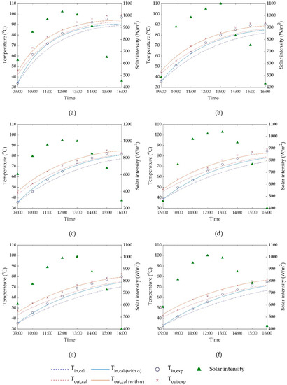 It is seen that the solar intensity change follows a similar trend for every experiment, i.e., it increases in the morning, reaches the highest level at about 12:00, stays at a similar level for 2–3 h and then decreases. No extreme drop of the solar intensity is observed for any experiment. The solar intensity level seems to be higher for the experiments with the water mass flow rates of 0.03 and 0.3 kg/s (Figure 12a,b). Moreover, it can be observed that the difference between inlet and outlet temperatures of water decreases when decreasing the solar intensity.