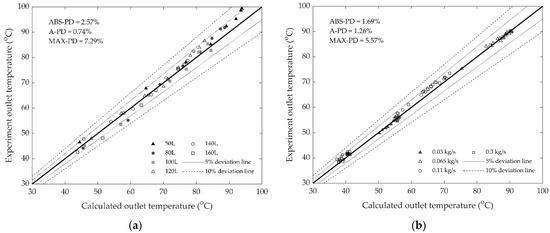 The calculation steps followed the procedure in Figure 6 from “Start” to “Calculate ”. Since in Elsheniti et al.’s work, the water inlet temperature was controlled by a fan cooling coil and a heater, the water outlet temperature was calculated based on the reported water inlet temperature at a particular time. The degree of deviation can be considered via the plot in Figure 10.