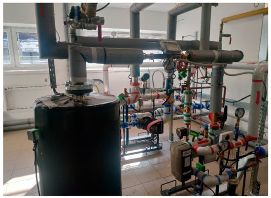 The research discussed in this article will be conducted at two laboratory stands. One is a district heating substation belonging to the Municipal Heat Engineering Company (MPEC) in Krakow, which has existed for many years in one of the Cracow University of Technology buildings (Figure 1). The other is a new laboratory stand, a heat substation located in the laboratory of the Department of Energy (DE) of the Cracow University of Technology (Figure 2 and Figure 3a).