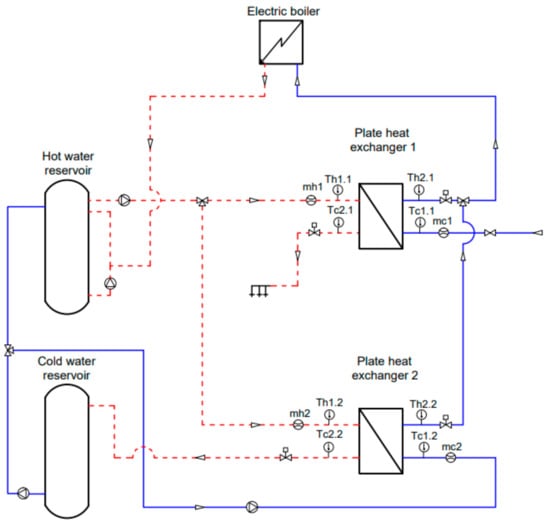 Scheme of the laboratory stand: red line—hot water, blue line—cold water.