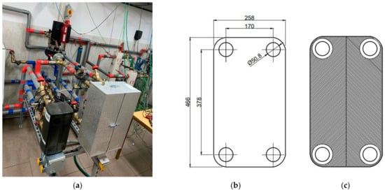 The heat substation located in the laboratory of the DE: (a) general view of the laboratory stand, (b) view of the single plate of Hexonic heat exchanger model LC110-30-2 with dimensions, and (c) view of a single panel with embossing included.