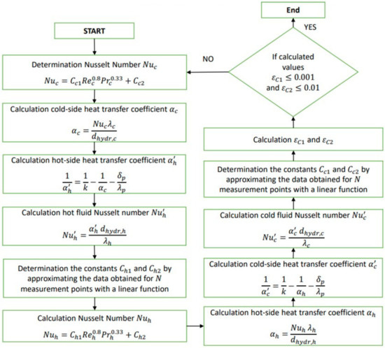 The developed method is based on iterative calculations. The single-iteration calculation algorithm presented in this chapter is for a single measurement point. Performing a series of iterations for several measurement points based on the described algorithm allows us to determine the Nusselt number correlation of the cold fluid .