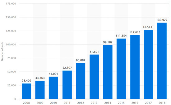 The first successfully drilled horizontal well was recorded in Texon in 1929, located in Texas. In 1944, a horizontal well was drilled in the Franklin Heavy Oil Field, Pennsylvania. Besides the U.S., China also tried horizontal drilling in 1957 and the Soviet Union in the 1960s and 1970s [3]. ARCO drilled the first medium-radius horizontal well with a length of 1500 ft in the Austin Chalk, Texas, in 1985 [4]. In the late 1990s, with composite plug development and zonal isolation technology, several horizontal well completion techniques were developed and categorized as openhole, uncemented slotted, and cemented liner completions [4]. In Figure 1, Statista summarized the number of horizontal wells drilled each year from 2008 to 2018, increasing five-fold due to growing shale oil and gas needs: “The increased productivity of wells with longer lengths has more than offset the effects of rig drilling fewer wells. Horizontal wells in the United States averaged about 10,000 feet of lateral length in the early 2000s but averaged 18,000 feet in 2019. The average linear footage per well increased from 6000 feet to 15,000 feet during the same period” [5]. The horizontal well drilling schemes are diverse, with different shale plays in geological structures, resource types, active or undeveloped areas, total organic contents, and drilling budgets. Table 1 summarizes the well-known predominant shale reservoirs regarding some of their properties and horizontal well parameters based on the data provided from the EIA full report. The average completion details of selected basins can be referred to in Table 2 and Table 3. Among these, the horizontal wells in the Barnett Shale play generally were drilled in 1000–5000 ft of lateral length, 100–1300 ft of treatment span, and 1–8 million gallon/well of proppant injection [6], and El Paso Corporation undertook a project with horizontal wells completed with 4000-foot lengths in Eagle Ford [7]. Mille et al. studied the compartmental completion technique application in Bakken Shale in North Dakota, where the horizontal wells can be characterized by lateral lengths of 4000 to 7000 ft with more than 150 gallons per foot of crosslinked stimulation fluid [8].