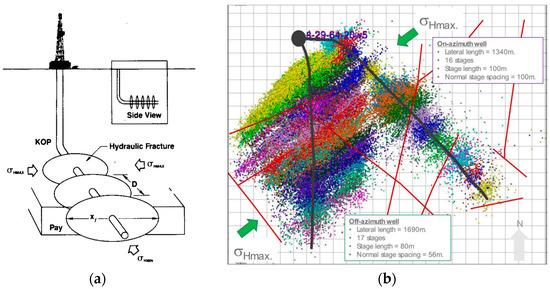 Horizontal well multistage transverse fracture diagram (a) [13] and microseismic stage events for different azimuth horizontal wells (b) [14].