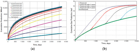 The effect of the number of transverse fractures on productivity (a) [16] and fracturing time effect on gas–condensate reservoirs (b) [17].