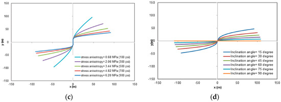 Different fluid pressure (a), differential fluid pressure with a constant stress anisotropy (b), constant fluid pressure with different remote stress conditions (c), and fractures inclined at different angles (d) [26].