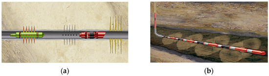 Over the past several decades, many innovative completion techniques focusing on the multistage fracturing of horizontal wells have been invented for open-hole, cased, and cemented completions to be compatible with different underground geological and geomechanical conditions and production objectives and schemes. In this section, several widely field-used conventional completion techniques are briefly summarized for description and comparison based on an elaborate study by Soliman et al. [12,27]. In cased and cemented completions, the most common method is the “limited-entry, cluster perforating and pump-down plug diversion method” (Perf and Plug), shown in Figure 6a, which has been successfully extensively applied in Barnett Shale in North Texas. After initial treatment with the coiled tubing system, each cluster from the individual stage is perforated by the explosive gun and isolated by composite bridge plugs from the toe toward the heel, and then the frac fluid is perforated into intervals. The process is repeated for each stage, and the plugs are milled out at the end of the treatment process. Although this method is comparably efficient, related issues such as premature screenout and the plug setting and uneven proppant distribution can cause low production efficiency. The nonideal efficiency can be remedied by an advanced technique known as “pinpoint stimulation”, by treating a single cluster per time with hydrajet perforating for constant and repeatable fracture sizes in each stage [28,29]. A newer open-hole method called the “ball activated sliding sleeve method” (BASS) in Figure 6b was developed to speed up multistage fracturing treatment by dropping incrementally larger balls to open frac sleeves in series to divert frac fluids within a single nonceasing pumping operation. Comparing the Perf and Plug method, the total perforating time decreased from 40 to 3 h [27], and the required completion time decreased within 50% to 70% [30]. In addition to the multistage completion mentioned above, the cased hole CT straddle-packer completion, compatible with energized or foamed fluids, deploys pre-perforation to decrease nonprolific time to improve efficiency and is more suitable for ductile reservoirs (Figure 7a). The ever-evolving hydrajet-assisted fracturing method, with the aid of hydrajetting energy, is extensively used in different completions without physical isolation equipment in a dynamic tubing movement (Figure 7b).