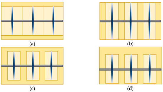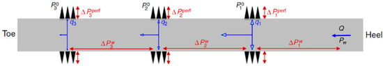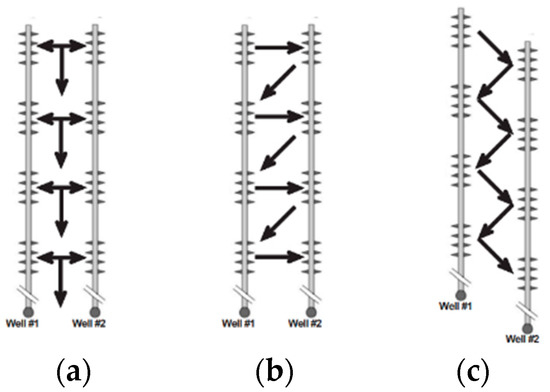 Multiple horizontal well completion schemes (a)—simultaneous hydraulic fracturing; (b)—sequential fracturing (Zipper Frac); (c)—Modified Zipper Frac [34].