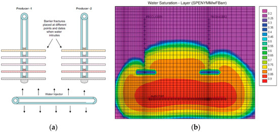 Multiple barrier fracture diagram (a) and simulated water saturation area profiles of a field study in Saudi Arabia (b) [35].