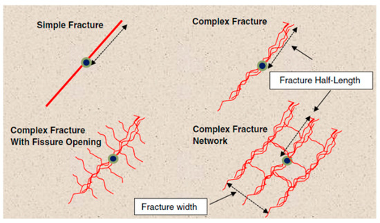 Since the 1950s, several groundbreaking theoretical fracture models have been developed for different dimensions under several related assumptions. The predominant 2D fracture models are the Khristianovic–Geertsma–de Klerk (KGD) model and the Perkins–Kern–Nordgren (PKN) model under the presumption of a plain strain and penny-shaped crack model of the line source. The pseudo 3D and planar 3D fracture models are broadly applied to simulate the fracture propagation and closure period to remedy the variable fracture height decreasing from the wellbore. Compared to the full 3D model, the pseudo 3D model decreases the calculation complexity and is better for routine designs. As Figure 13 shows, Adachi et al. [43] summarized and compared different dimensional propagation models and their flow mechanisms. This section discusses the fracture propagation process regarding fluid flow, material balance, and other geomechanical aspects.