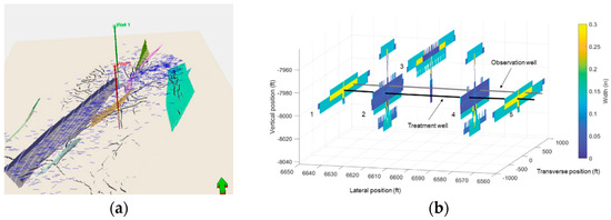 McCormick Oil Company and Halliburton Services, joined by national and international oil companies, conducted the first fracturing horizontal well “experiment” in a joint field project, demonstrating the integration possibility of fracturing to other well techniques and enhancing the comprehension of fracturing horizontal wells [12]. M.Y. Soliman and his colleagues in Halliburton innovated the multistage fracturing technique for horizontal wells, first reported in the SPE Forum in 1987 and published in 1990 [13], where they also discussed stress, fracture direction, conductivity, fracture, and well optimization, which explained the essential aspects of fracturing horizontal wells. Athabasca Oil Corporation conducted a microseismic trial with one on-azimuth and one 45° off-azimuth in the Duvernay Formation, as shown in the microseismic map of Figure 2b (fracture stages are depicted in multiple colors) [14].