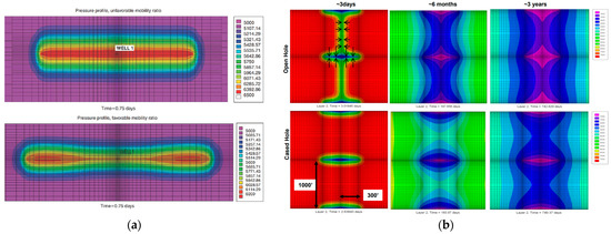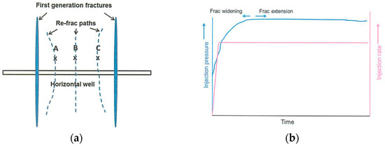 In order to restrain the water-channeling issues in water-injection scenarios with an adverse recovery efficiency, Sierra et al. [35] came up with a new completion methodology for transverse horizontal production wells, which considers placing nonconductive fracture barrier fractures (NCBFs) sequentially at the horizontal production wells to modify the water front, delay water intrusion, and improve water-sweep area, as shown in Figure 11a. This technique can be applied during any phase of the open-hole completion process using the modified hydrajet-assisted fracturing completion and provides a more flexible design for water-injection projects with inflow-control devices (ICDs) and inflow-control valves (ICVs). The optimum option for the injection well is a vertical well, and the horizontal injection well and partial injection with partial production of one horizontal well schemes can also be considered. This methodology is more cost-efficient regarding produced water disposal, which can alsopotentially applied to other EOR scenarios.